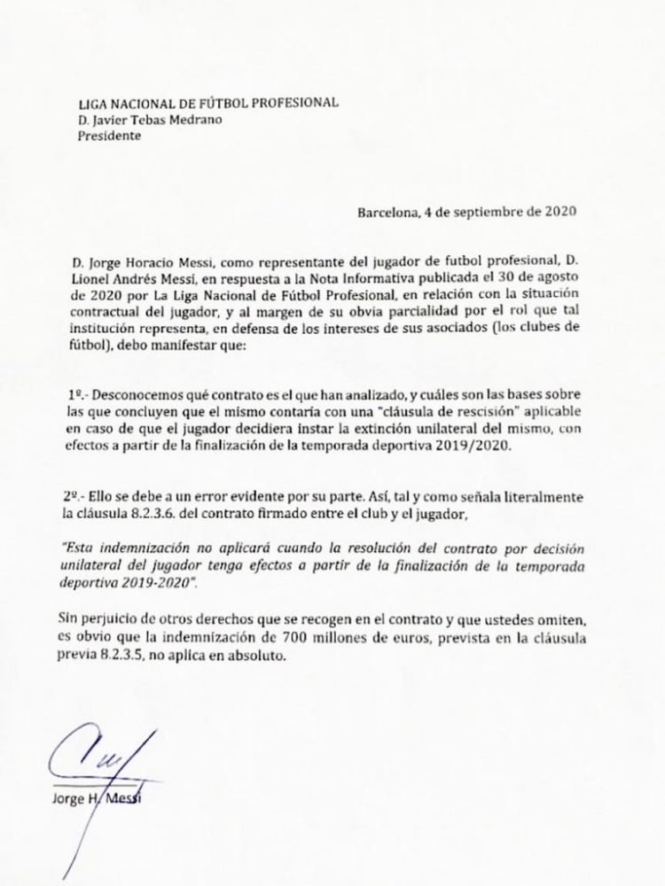 Jorge Messi, en representación de su hijo Lionel, le contestó a la Liga española que había emitido un comunicado días atrás advirtiendo que no le entregarían el pase. El representante aseguró que no efectuarían la baja del jugador si no se abonaba previamente la cláusula de 700 millones de euros.