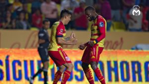 Gabriel Achilier (der.) celebra un gol con el Monarcas sobre el Juárez