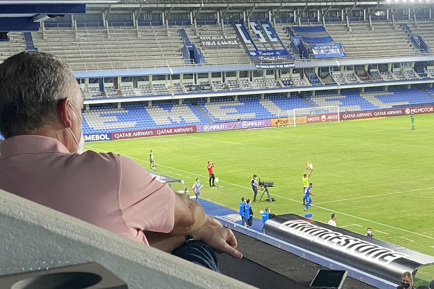 El director técnico de la selección ecuatoriana, Gustavo Alfaro, junto a integrantes de su cuerpo técnico, asistieron este miércoles 28 de abril de 2021 al estadio Capwell para seguir de cerca el partido entre el Club Sport Emelec y el Red Bull Bragantino por la Sudamericana y posteriormente al Monumental para el choque Barcelona y The Strongest en la Copa …